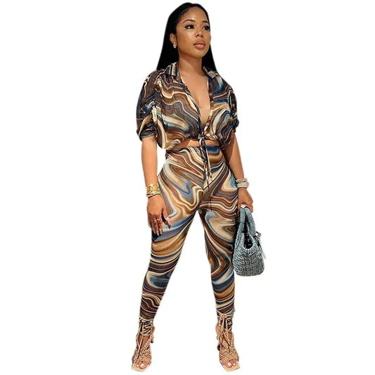 2 Piece Set Abstract Print Sheer Mesh Outfits