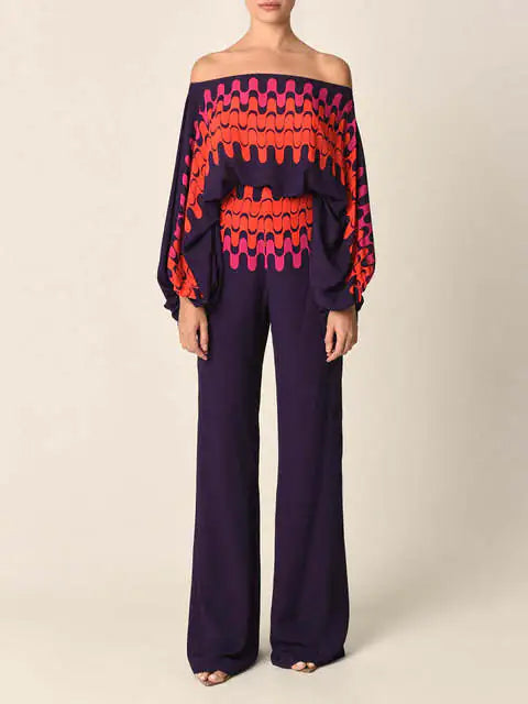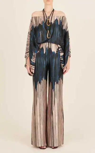 The set includes a stylish off-shoulder top with lantern sleeves, adding a touch of drama and sophistication to your look. The wide-leg pants complete the ensemble, offering both comfort and style with their relaxed fit and trendy silhouette.