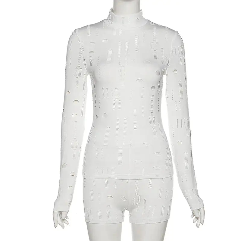 Style Meets Comfort: Who says fashion can't be comfortable? Our set effortlessly blends edgy ripped shorts with soft, snug long sleeves, guaranteeing you look and feel your best from sunrise to sunset.