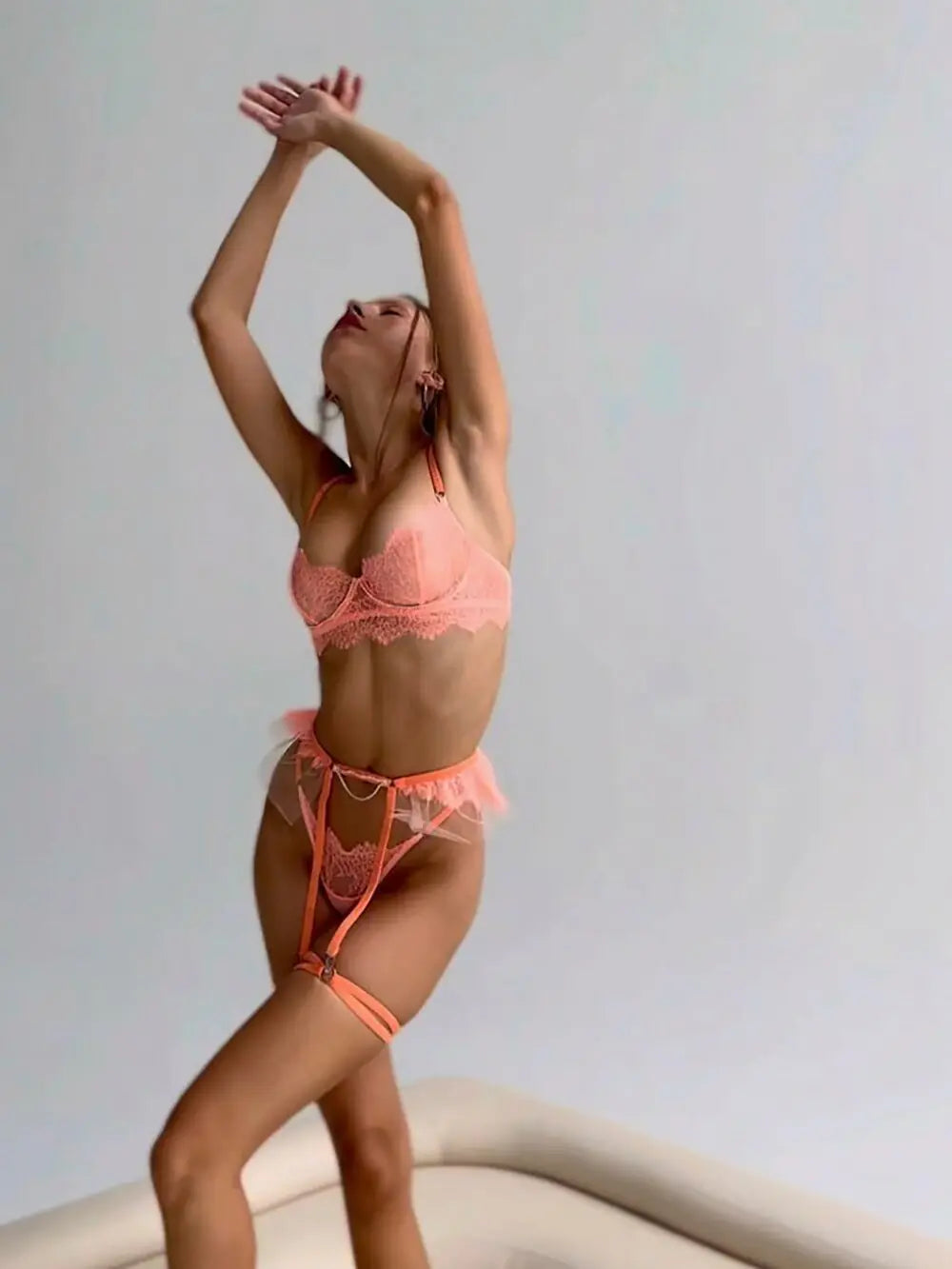 Stand out in the striking orange Transparent Lace Lingerie Set. Its vibrant color and intricate lace patterns create a bold and memorable look. Express your unique style and leave a lasting impression with this stunning outfit.